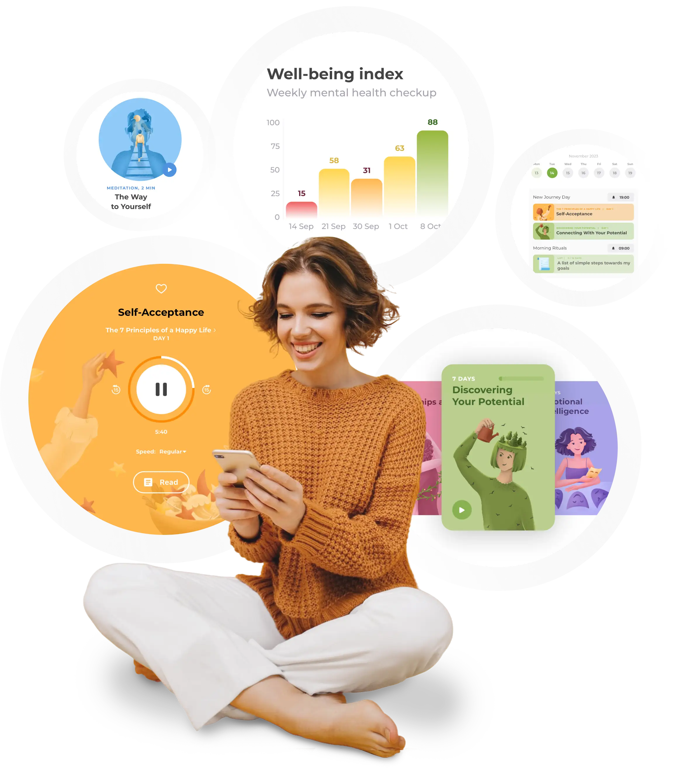 Mood tracking to detect daily emotional fluctuations, a wellbeing index to gauge overall mental health and specialized assessments for conditions like depression and anxiety. Insightful analyses and detailed monthly reports to track progress and inform wellbeing strategies.