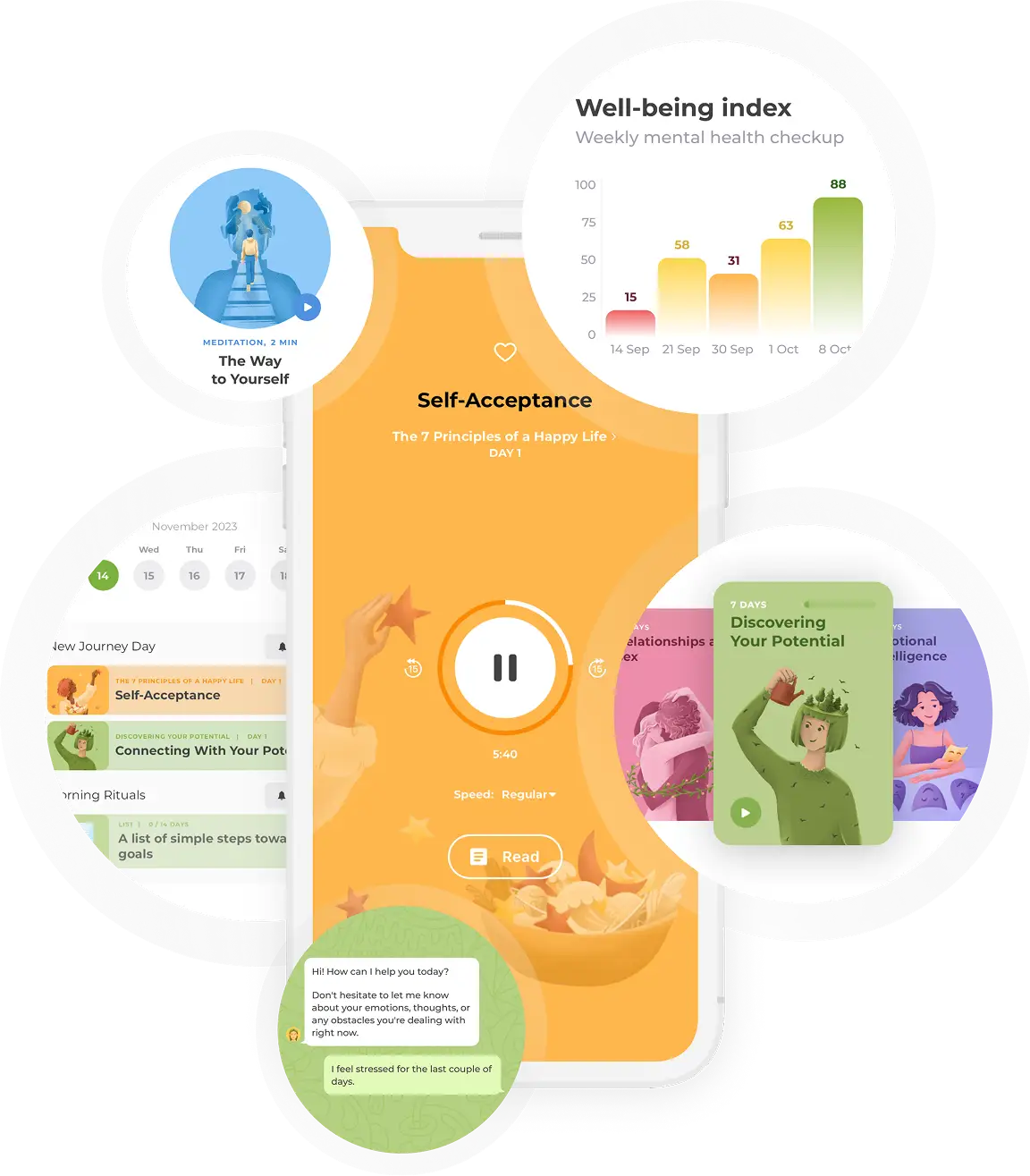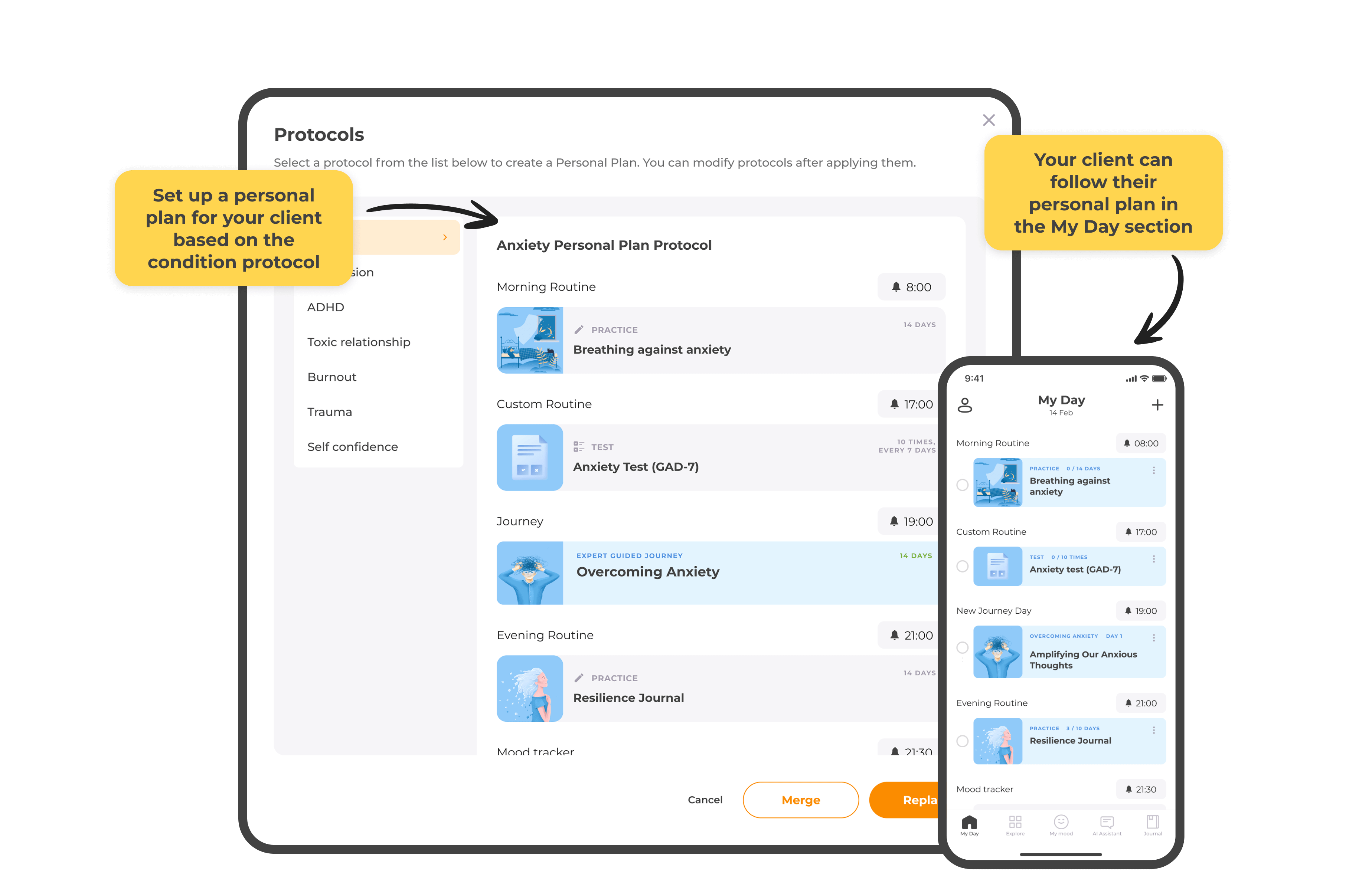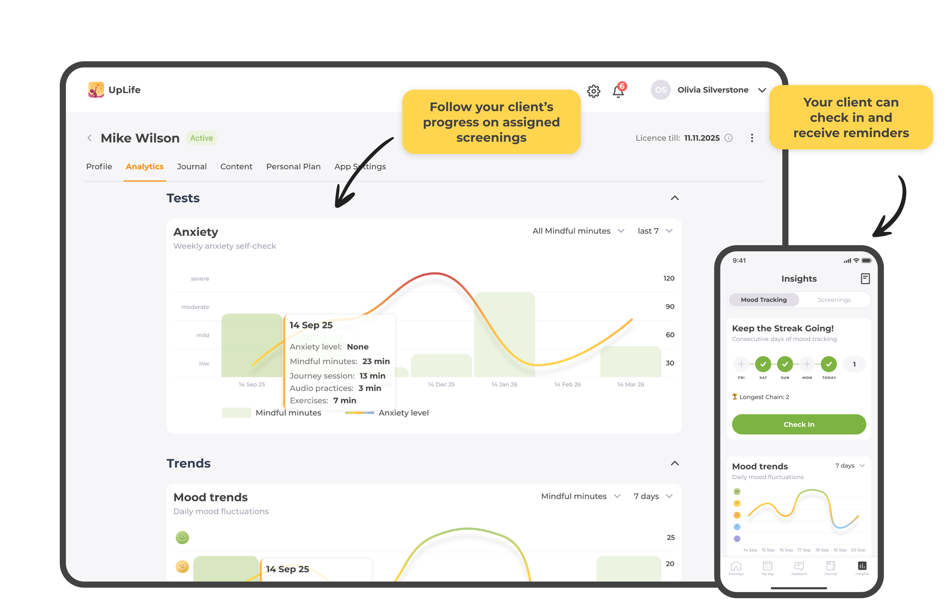 Your clients benefit from an easy to use, beautifully designed, mobile app that follows your treatment plan set using the Therapist Portal. Access to the app as a part of your UpLife for Therapist subscription, clients don’t pay anything.
